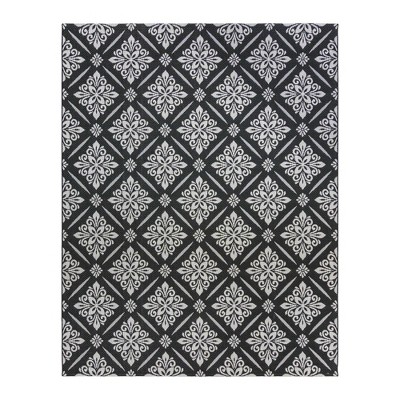 Ivory and black geometric reversible ash indoor outdoor rug.